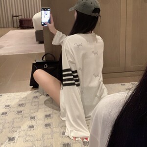 2025早秋女装新款时尚全身烫钻小狗狗四条杠纹宽松长袖T恤衫上衣