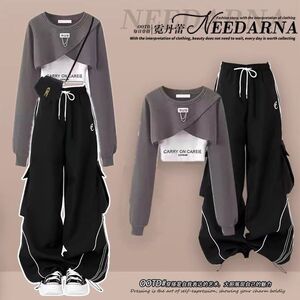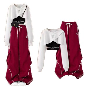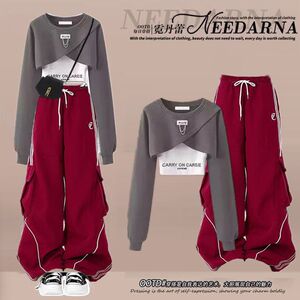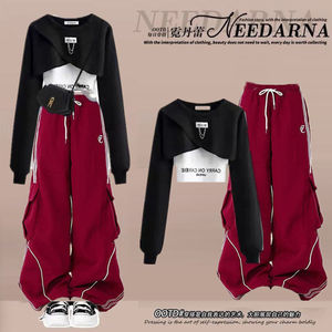 新中式夏季多巴胺酷飒盐系安可拉红工装裤辣妹套装学生装三件套