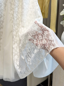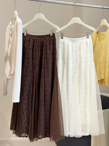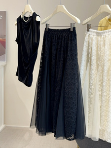 蕾丝拼接网纱提花半身裙女秋季中长款松紧腰显瘦大摆a字纱裙半裙