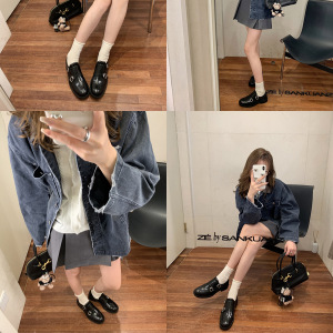 牛皮版~葡萄妈同款摩登腔调miu雕花扣带粗跟牛津乐福单鞋女小皮鞋