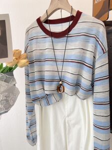 二本线(索罗娜领口)大码240斤条纹圆领防晒长袖t恤女夏季宽松上衣