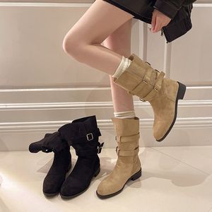 2025新款复古堆堆靴子秋冬粗跟超绝圆头西部牛仔靴女中筒靴磨砂皮