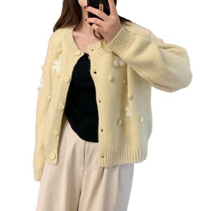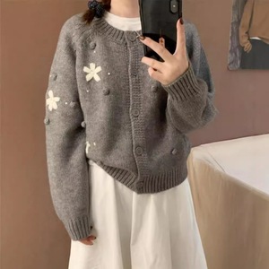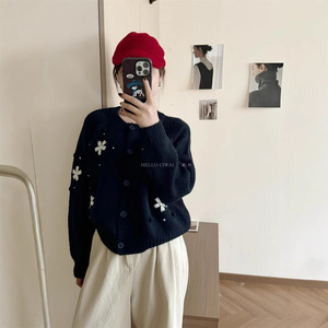 重工立体刺绣花朵圆领毛衣外套女秋冬宽松设计感软糯厚实针织开衫