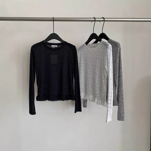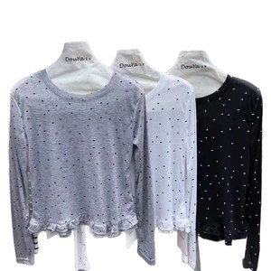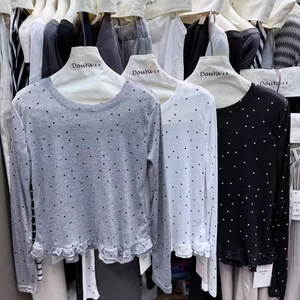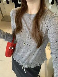 2025年韩系新款波点拼接荷叶边圆领长袖T恤女洋气显瘦上衣打底衫