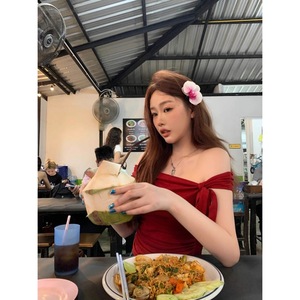 彩棉罗纹 夏季纯欲风一字肩露肩T恤设计感绑带修身短款甜辣
