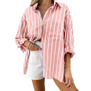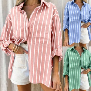 大量现货跨境欧美亚马逊2025春夏宽松polo领条纹口袋可挽袖带衬衫