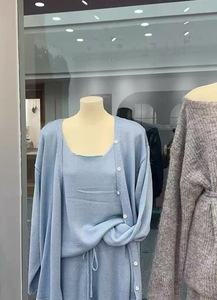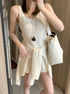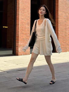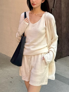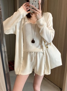 早秋新款女装休闲百搭宽松慵懒薄款长袖针织开衫背心短裤三件套潮