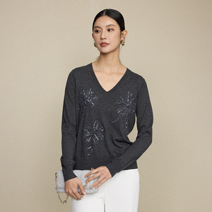 B*C重工浮雕植绒亮片刺绣气质V领针织衫精纺羊毛上衣薄款毛衣女