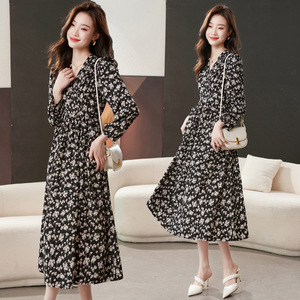 春秋季新款法式复古收腰长裙气质显瘦长袖黑色碎花连衣裙女