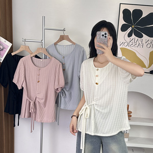 200斤胖妹妹夏季新款韩版时尚系带蝴蝶结提花短袖大码女上衣7819