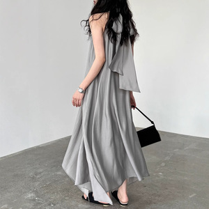 NS度假风法式天丝飘带挂脖连衣裙女夏高级感露肩仙女长裙3567