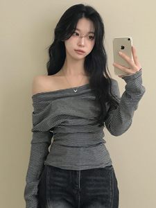 chic秋季复古条纹一字肩褶皱收腰长袖T恤辣妹修身休闲韩风上衣女