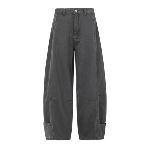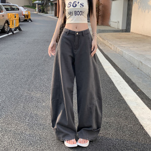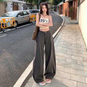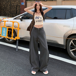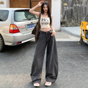 ZYZA美式复古深灰色弯刀裤女新款夏日薄款高腰小个子阔腿牛仔裤