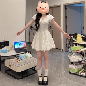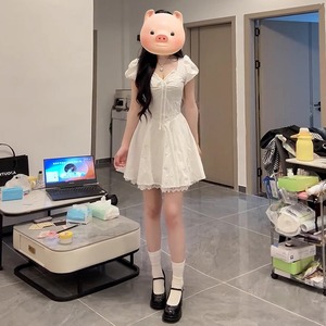 夏季2025新款掐腰爆款独特漂亮白色连衣裙女小个子蕾丝边蓬蓬短裙