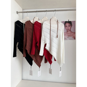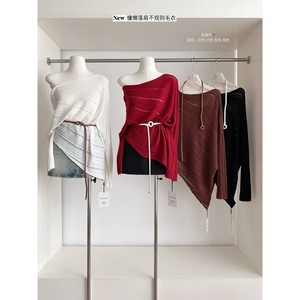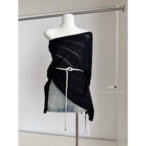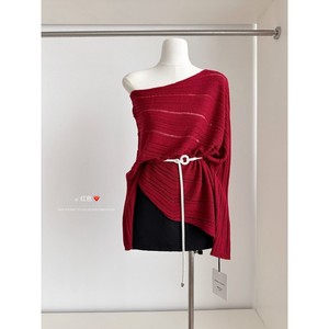 秋上新!韩系慵懒不规则一字肩镂空针织衫女复古宽松绑腰带上衣
