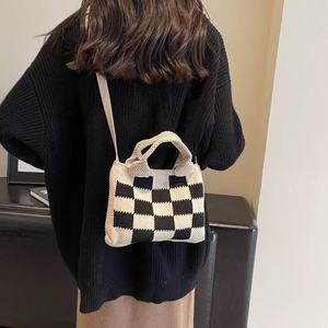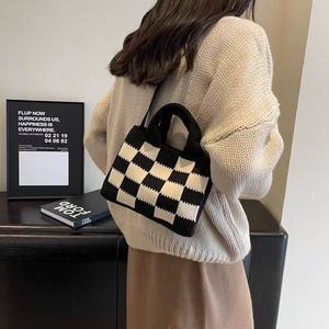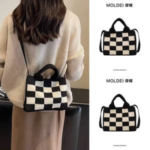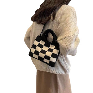 复古针织手提格子包单肩时尚女包黑白棋盘格韩版手拎包斜挎小方包