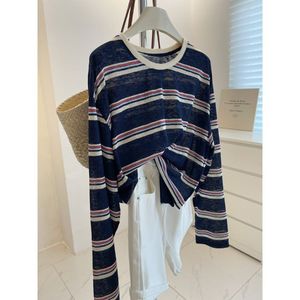 复古显白撞色圆领条纹防晒衫女垂感宽松休闲T恤新款长袖上衣女