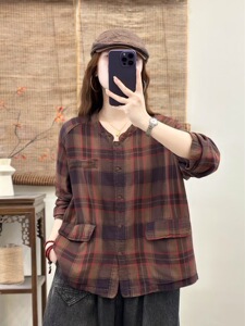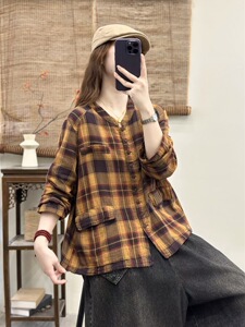 双层棉纱格子衬衫女2025秋新款宽松百搭休闲时尚口袋开衫上衣7742