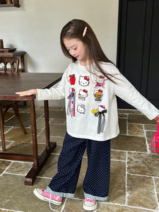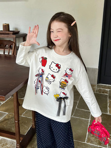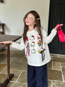AINI女童Kitty小猫卡通印花白色长袖T恤儿童女孩蝴蝶结百搭打底衫