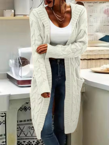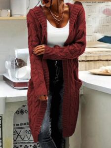 外贸跨境秋冬新款欧美女式连帽开襟针织衫毛衣大码口袋麻花外套女