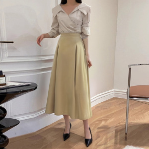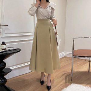卡其色设计感西装a字裙2025春秋中长高腰伞裙显瘦小个子半身裙女
