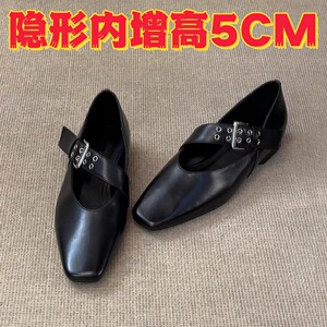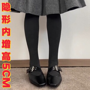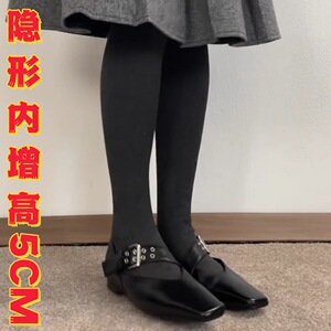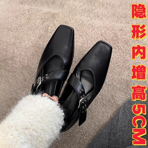 现货~内增高5cm个性黑色复古小皮鞋女一字扣方头玛丽珍鞋浅口单鞋