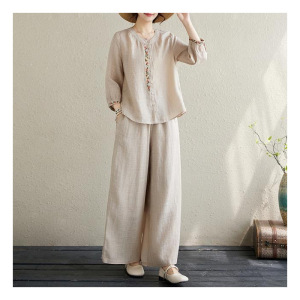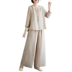 春夏季复古中式国风刺绣衬衣宽松气质休闲裤子两件套棉麻套装女