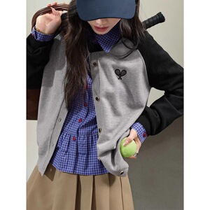 灰色针织衫运动毛衣女2025春季新款撞色插肩袖开衫短上衣秋冬