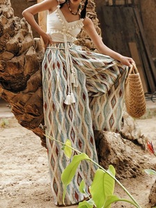 100聚酯纤维 度假风印花宽松阔腿裤高腰休闲裤后妈裙民族风裤子