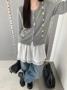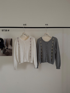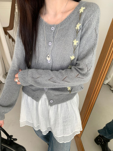 THINK十三行韩系软糯薄款针织开衫女25钩花清新甜美减龄毛衣外套