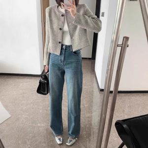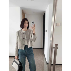 春秋新款复古圆领单排上衣条纹气质宽松香风气质时尚外套