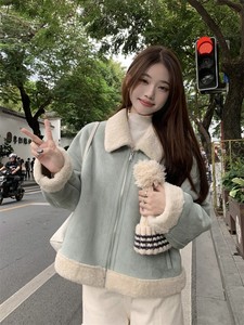 蓝色皮毛一体羊羔毛外套女冬季韩系甜酷炸街小个子短款麂皮绒棉服