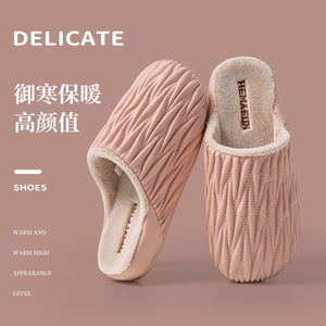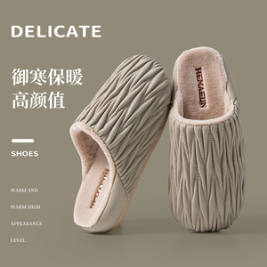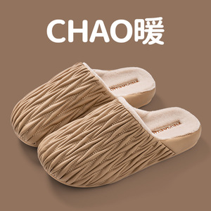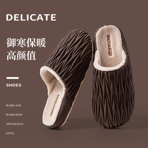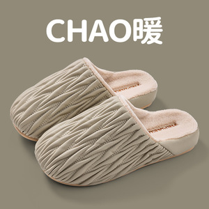 2025秋冬季新款远港褶皱棉拖鞋女室内家居防水保暖居家加绒皮拖男