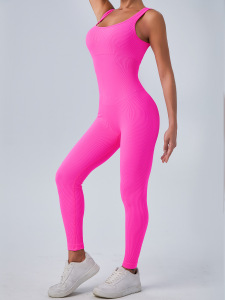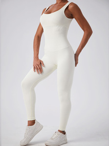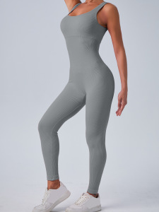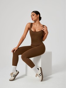 跨境女士瑜伽健身连体衣棕色纯色弹力针织面料收腹高弹力适合瑜伽