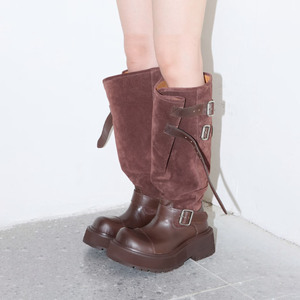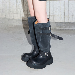 牛皮版~欧美辣妹厚底增高6cm长筒靴女复古皮带扣大筒围堆堆工装靴