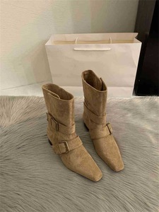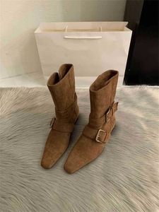 靴子女新款秋冬季复古方头绒面短靴女粗跟宽筒靴可折翻棕色西部靴