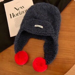 蓝色针织毛球马海毛护耳帽女秋冬季显脸小毛线帽加厚保暖雷锋帽子