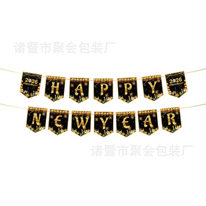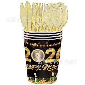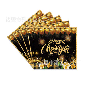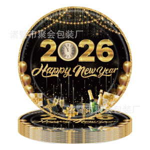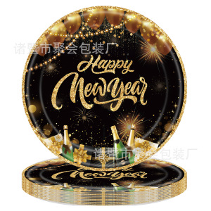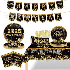 2026黑金新年派对用品装饰跨年狂欢纸巾叉拉旗一次性餐具布置套装