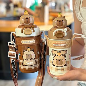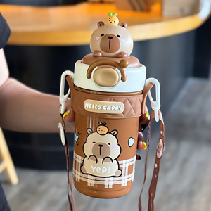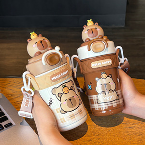 可爱卡皮巴拉点点格纹学生保温杯锁扣设计可调节杯绳硅胶吸嘴水杯