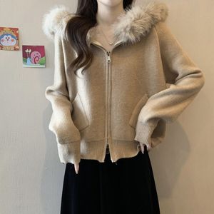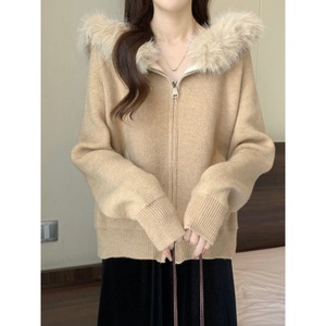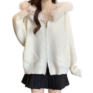 韩系慵懒风毛毛领毛衣外套女秋冬新款甜美温柔双拉链针织开衫上衣