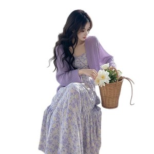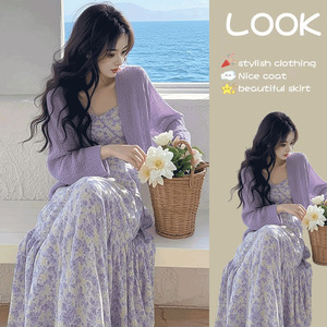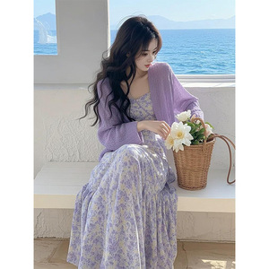 温柔风气质紫色碎花连衣裙女装2025春季新款法式绝美度假风套装裙