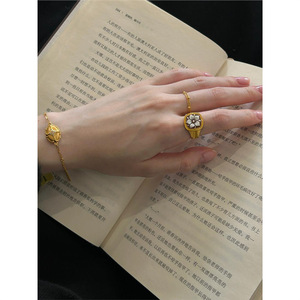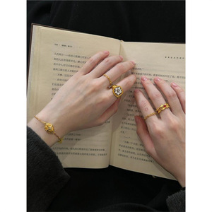 中古贝雕花朵小方块戒指复古vintage金色素圈 叠戴食指戒小众设计
