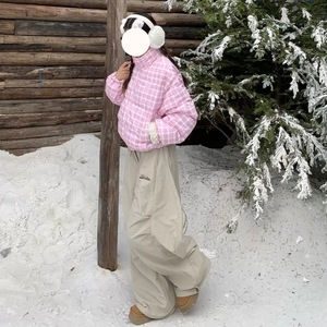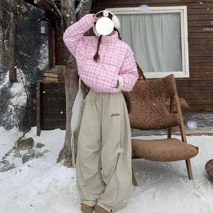 欧洲学院风甜美短款粉色格纹立领棉服女冬季新款保暖时尚防寒外套
