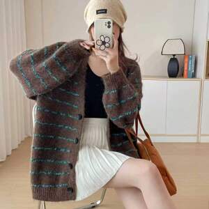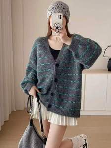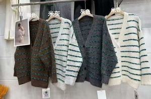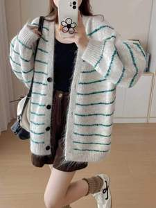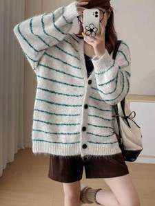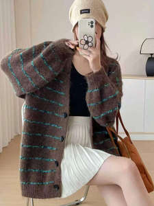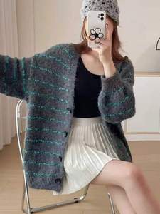 2025秋冬新款条纹针织开衫复古时尚跨境外贸宽松慵懒风毛衣外套女