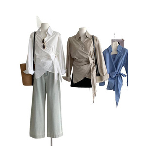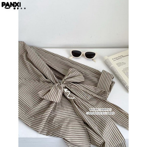 2025早秋新款韩版气质不规则长袖条纹衬衫女宽松舒适绑带设计上衣