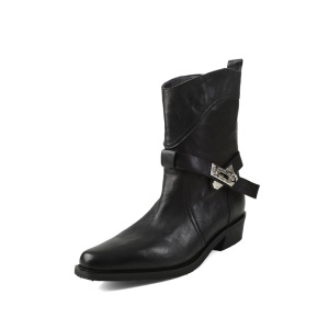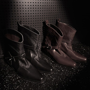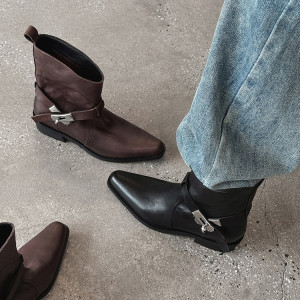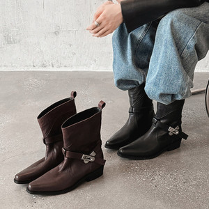银扣粗跟短靴女单靴秋冬新款头层牛皮方头中跟套筒欧美女式短筒靴