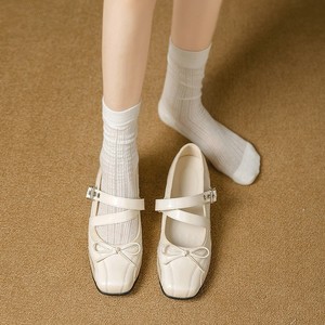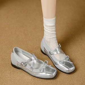 夏季百搭蝴蝶结芭蕾舞平底浅口鞋银色真皮复古内增高6cm玛丽珍女