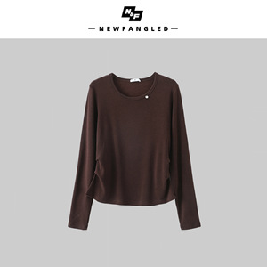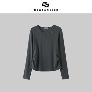 秋季女圆领显瘦针织衫设计感长袖T恤褶皱收腰打底衫休闲纯色内搭