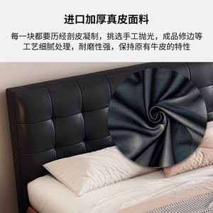 意式极简真皮床轻奢现代简约黑色华夫格床中古风齐边床实木床婚床