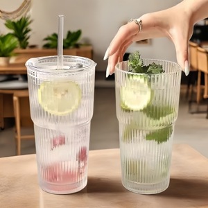 高颜值竖条纹玻璃杯咖啡杯冰美式家用带盖带吸管水杯拿铁饮料杯子